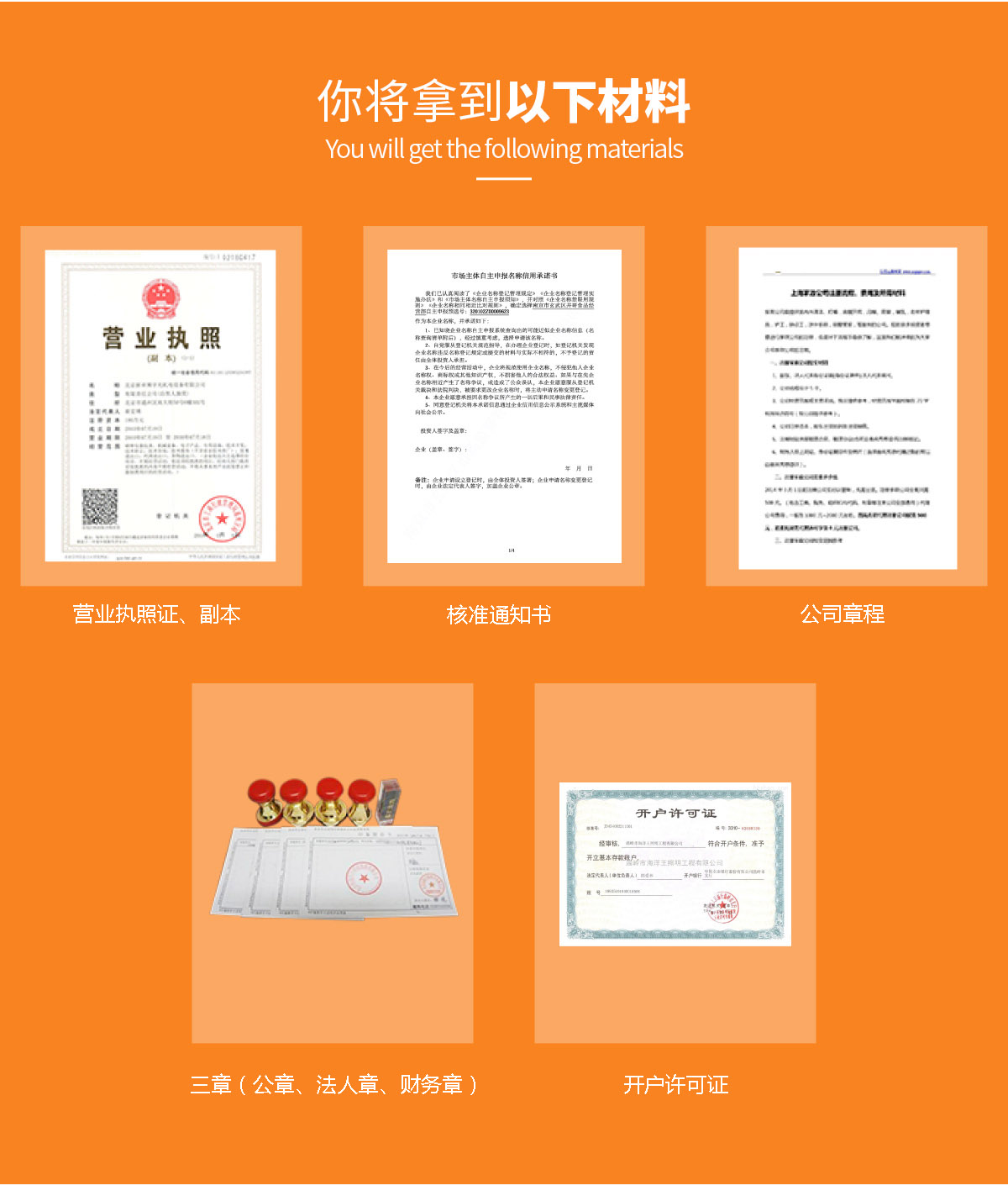 公司名称 3-5个公司名称 注册地址 地址要求咨询客服 注册资金 注明认缴实缴 投资比例 各股东的股份配比 监事及身份证明 法人不可以当,监事 法人及股东身份证明 资料要求咨询客服